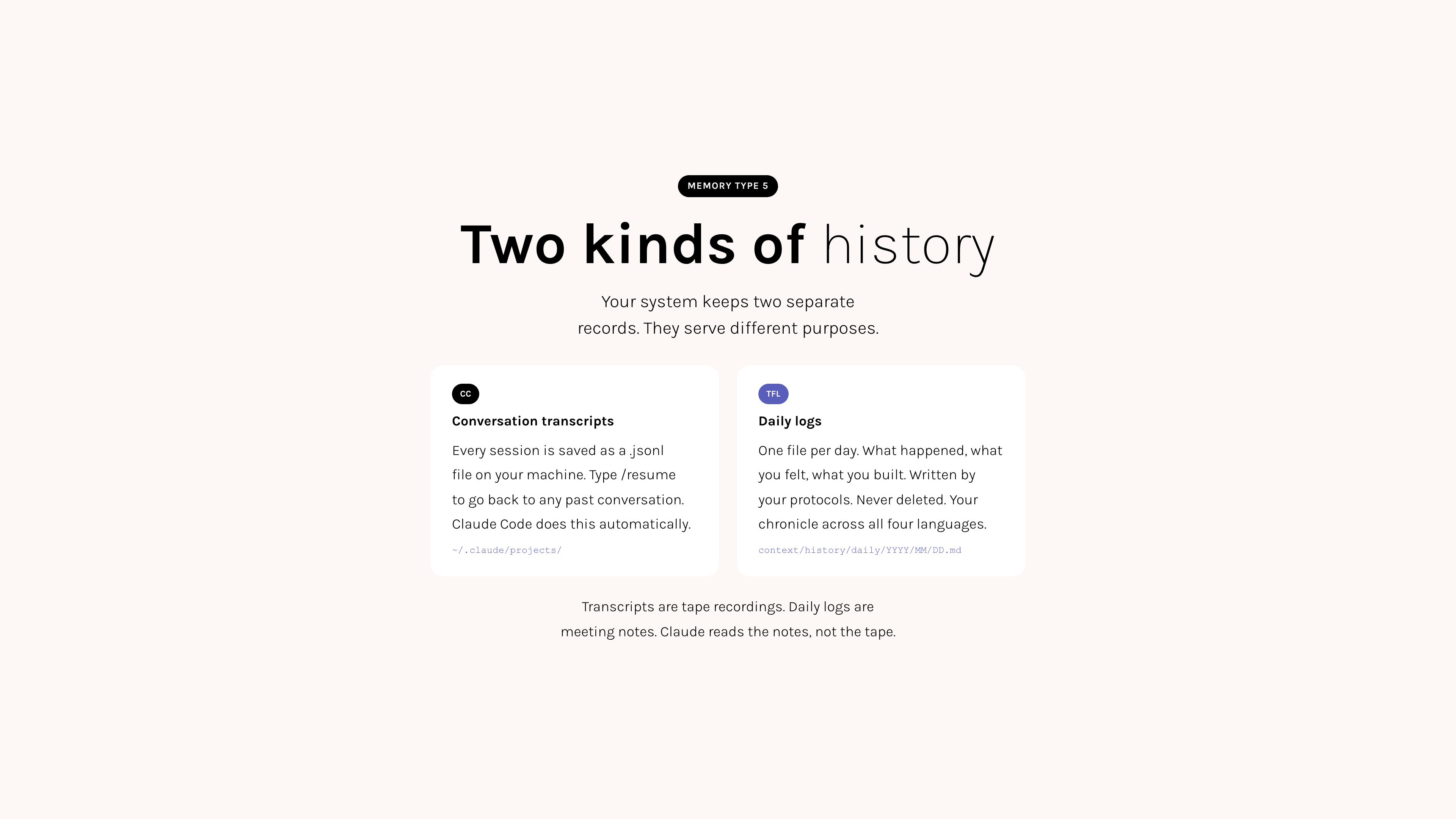 Think of it this way. Your conversation transcripts are a tape recording of a meeting. Saved on your machine, playable anytime. Your root system files (CLAUDE.md, memory, fact files) are the meeting notes you bring to the next meeting. The tape recording exists, but Claude only reads the notes.